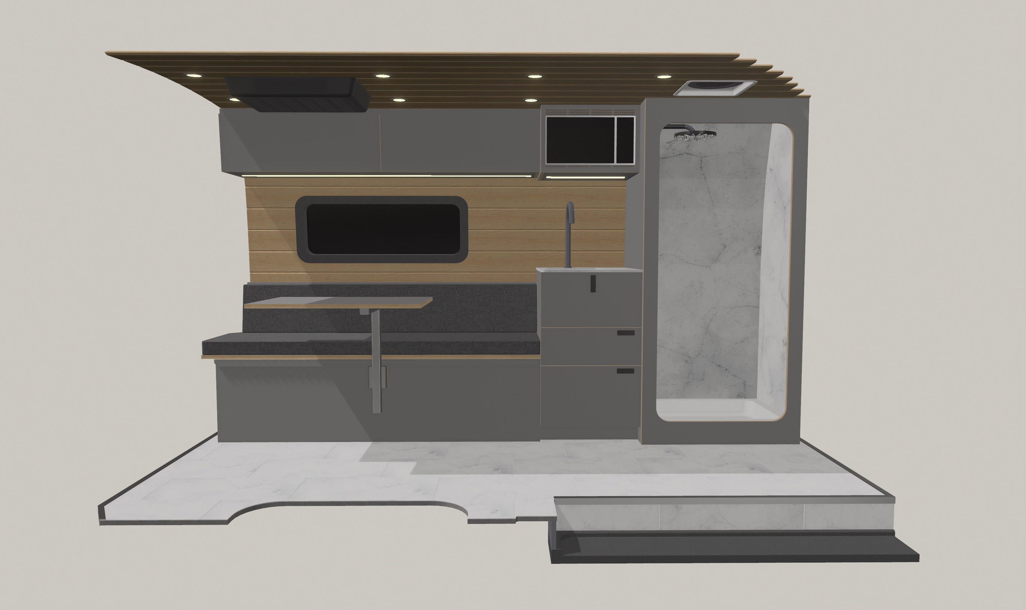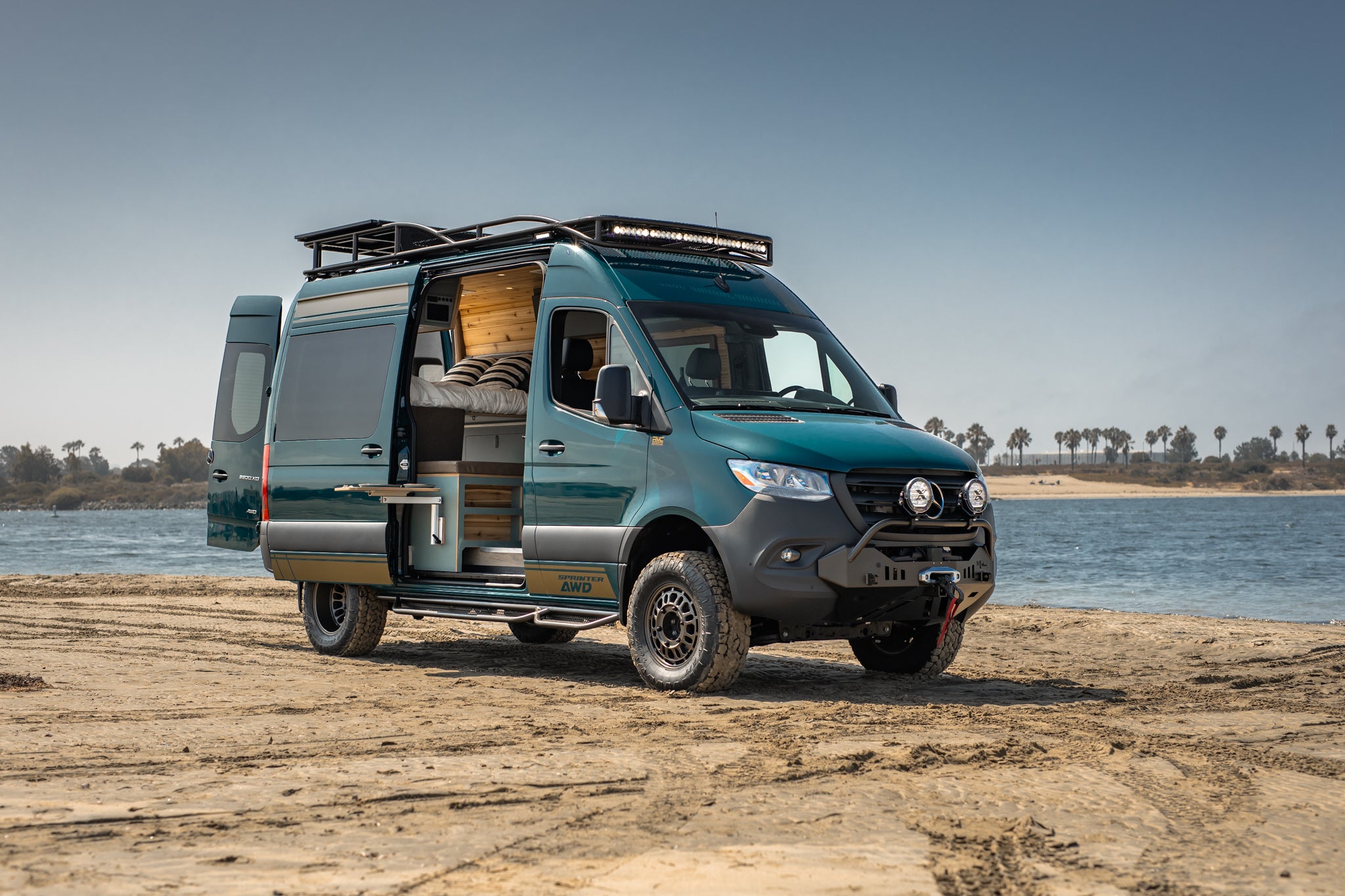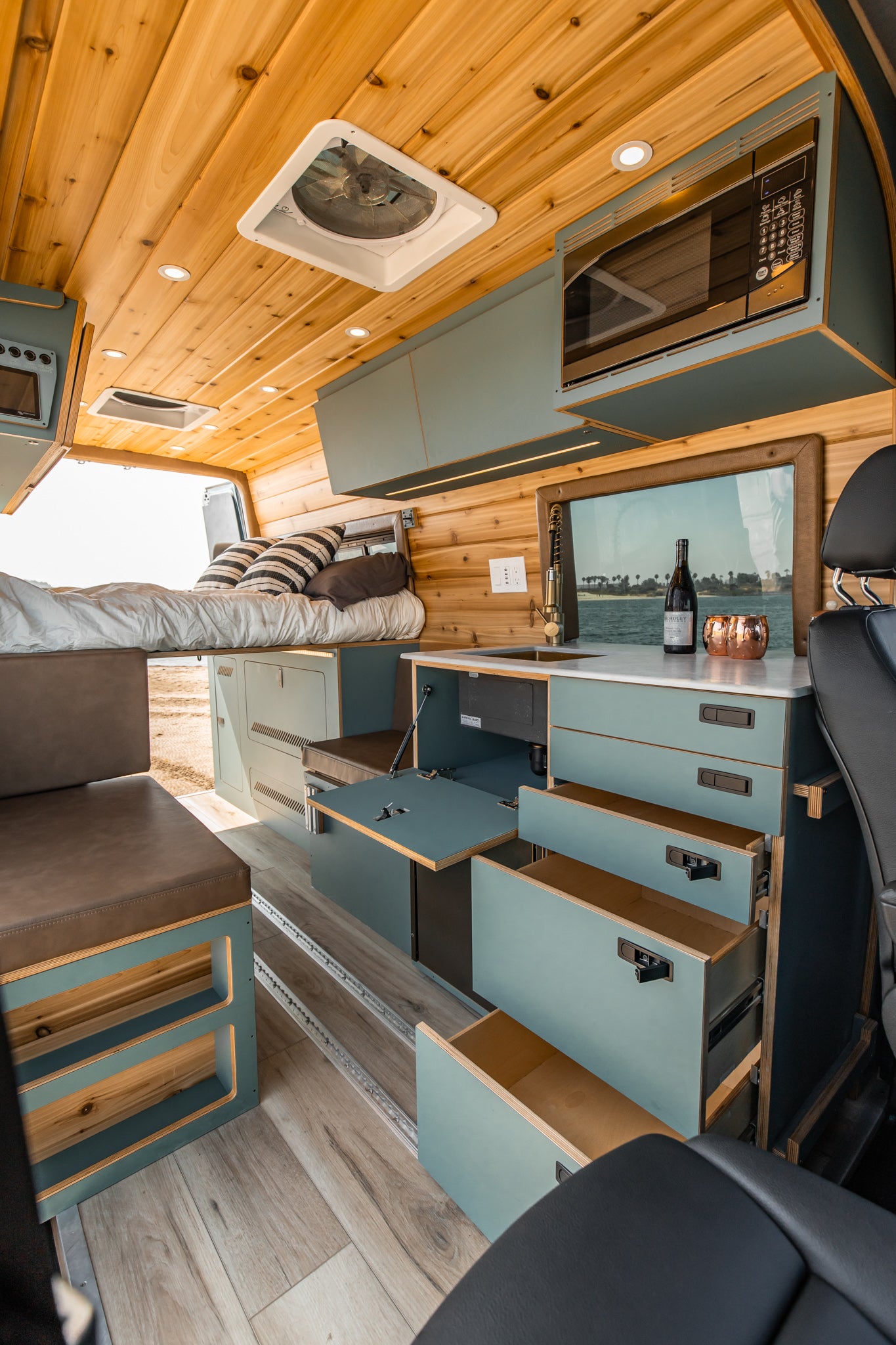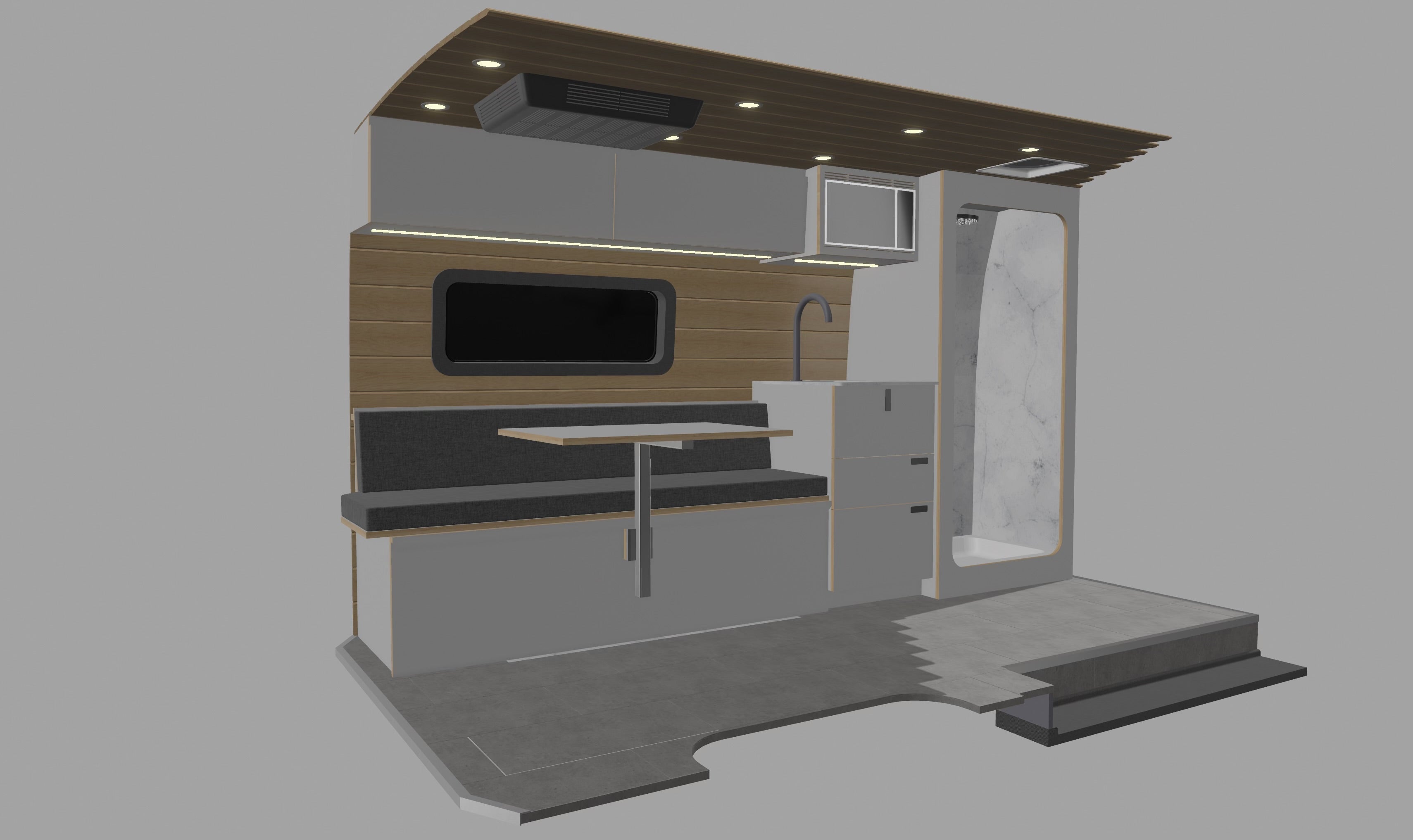 The Rogue Palisade features (also pictured with optional rooftop tent or integrated pop top) features a best in class 40" shower and wet bath behind the Driver's captain chair, followed by a petite split kitchen and dueling benches/dinette that convert into a bed.  Electrical is housed in the Passenger side bench, while water is housed in the Driver's side bench. Many customers choose to add either a cab bunk system up front for up to one extra bed for younger kids, or they opt for a rooftop tent, whether that be externally accessible or an integrated model that is accessed from the inside of the van.