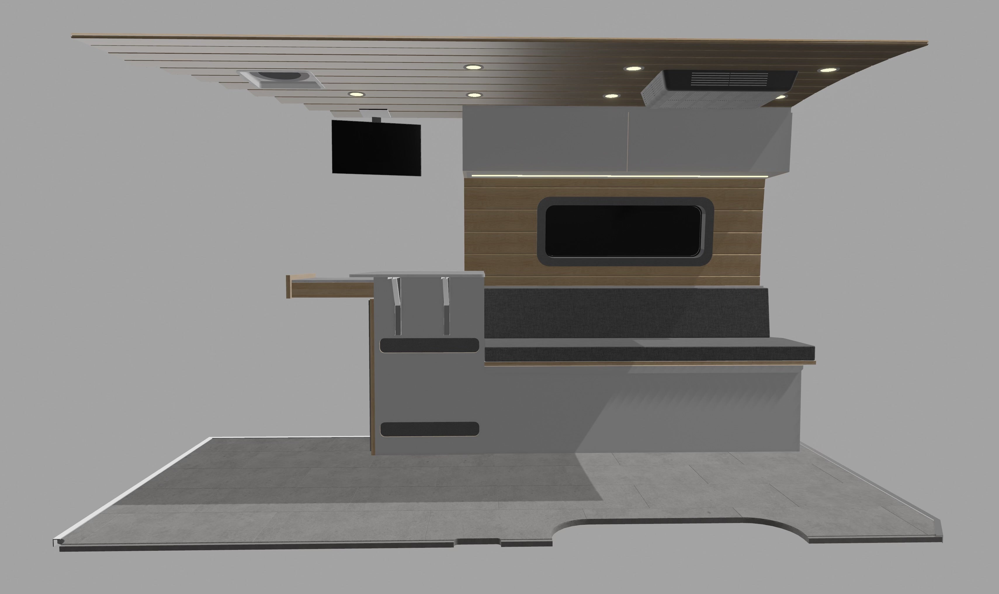 Rogue Van Company's latest floorplan, the Overlander, introduces a sophisticated design, showcasing a fixed flarespace bed that elegantly folds at the center, creating an unobstructed walkway through the entire van. This central pathway is equipped with L-track and Smartfloor seating, providing ample space for up to three additional removable seats with belts and Isofix points.