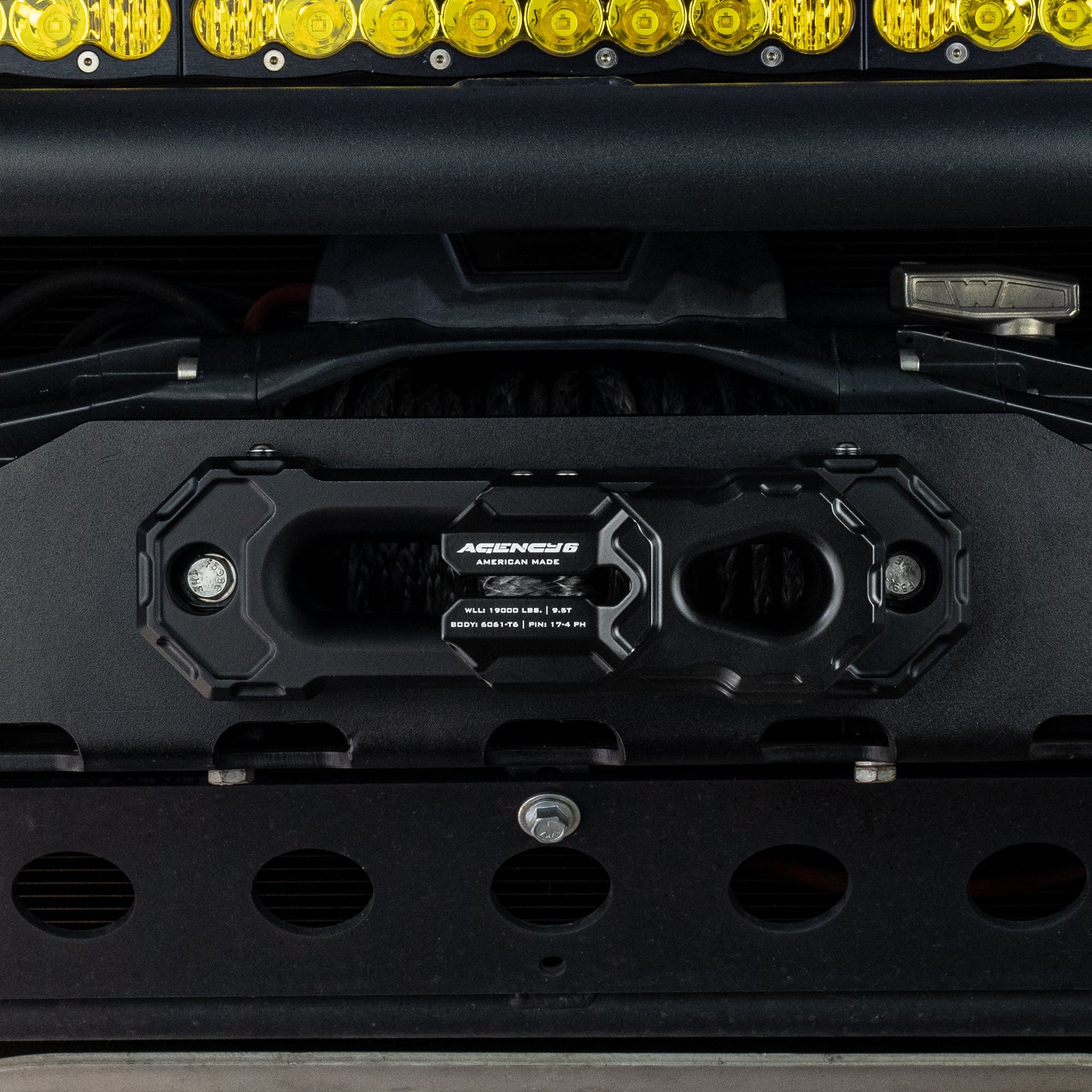 Field serviceable winch attachment made from US Certified 6061 T6 CNC machined aluminum with a 17-4 hardened stainless pin.