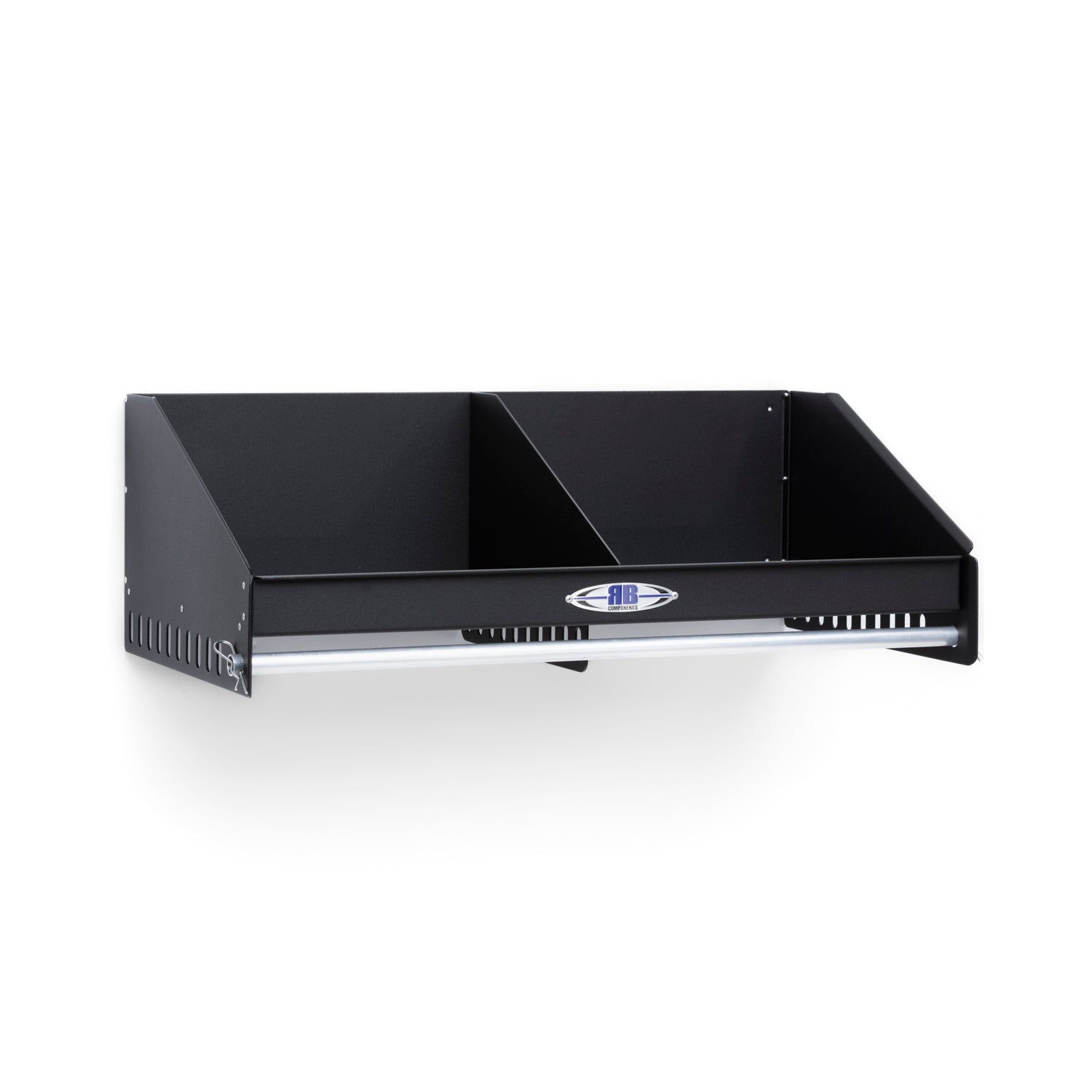 RB Components has extended our line of helmet bays by offering a double helmet bay. Prevent unwanted nicks to your helmets and hang multiple items. Made from durable powder-coated aluminum, this storage shelf will stand up to years of abuse. No other manufacturer combines helmet storage, removable goggle bar and closet packed into one. This storage shelf mounts easily into your trailer, shop or garage wall. Shelf comes completely assembled and ready for use. Pictured helmet, goggles, shirt and plastic hanger are not included. Proudly Made in the U.S.A.