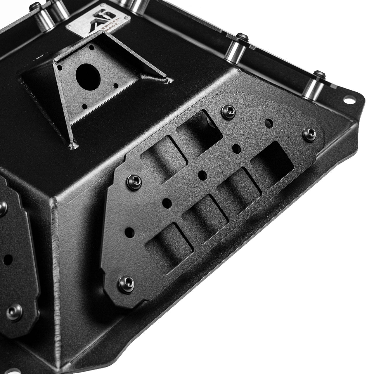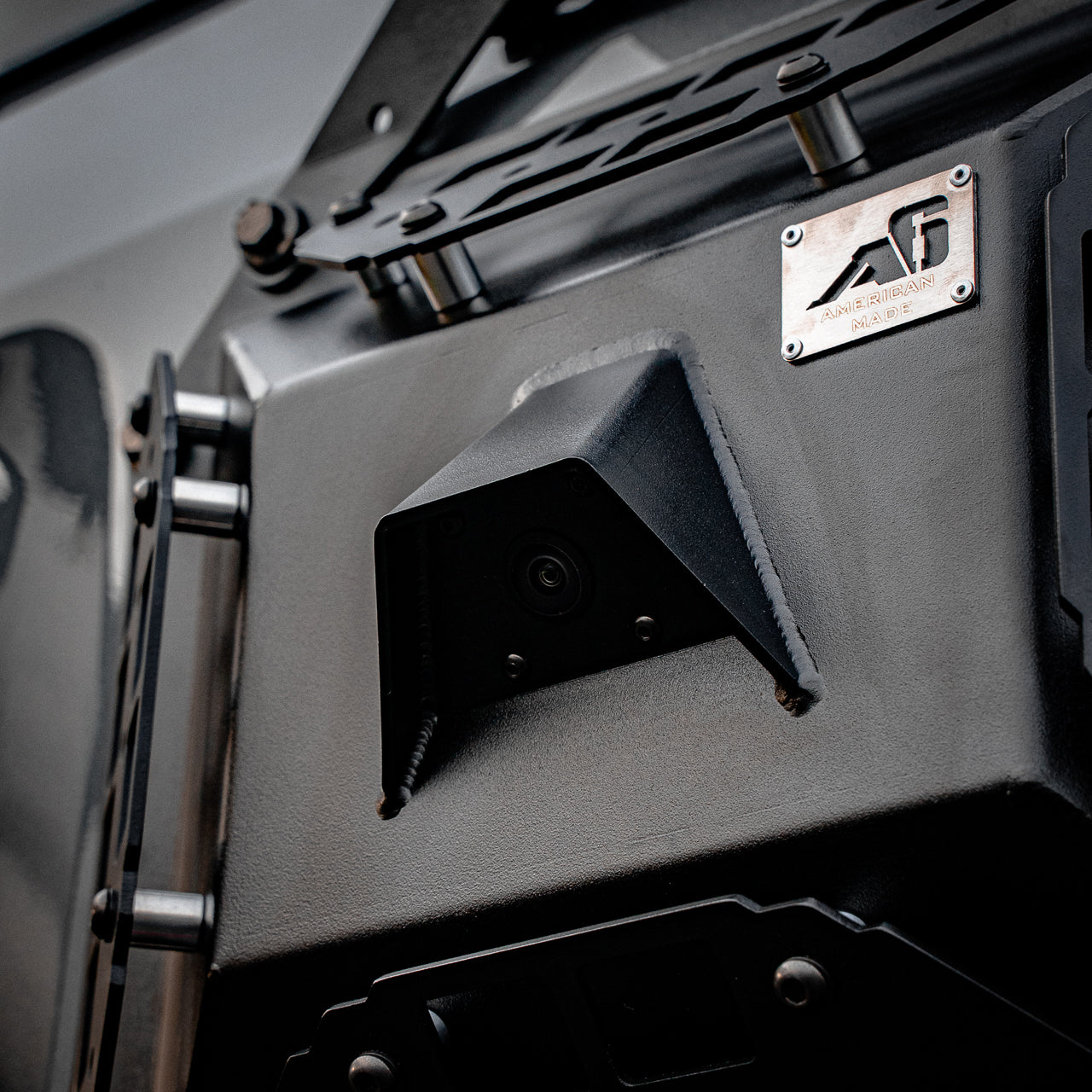 MOLLE pattern cutouts allow for mounting a range of camping and off-road accessories, securely strapped directly to the panel. Easy to install, bolts into factory locations utilizing machined aluminum adapters. The integrated camera and brake light mounts allow you to keep your factory back-up camera and brake light.