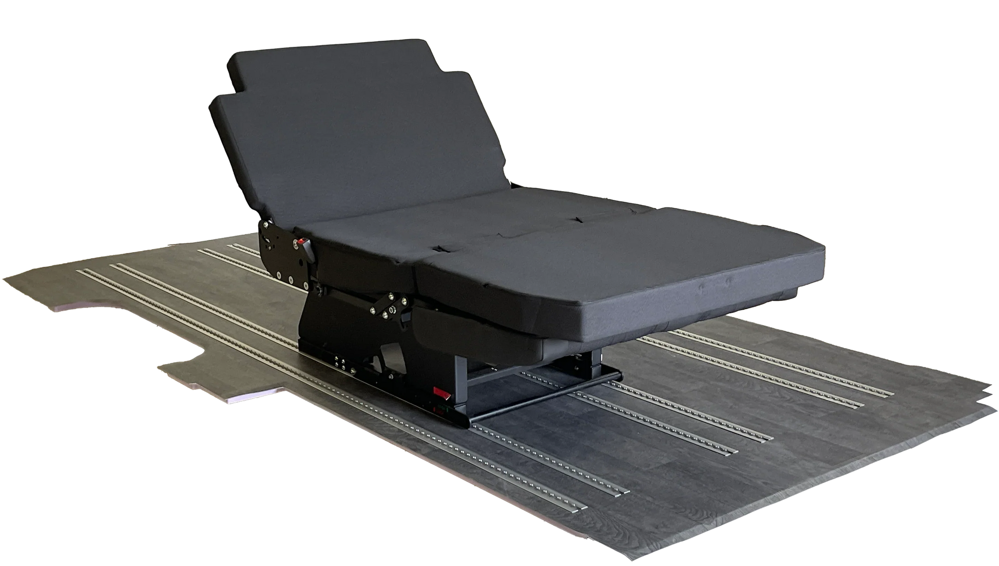 Install the MobiFrame Seat Bed with the MobiFrame Sprinter SafeTrack Composite Floor System for 2007+ Mercedes Sprinters for the ideal traveling and custom bed/seating experience