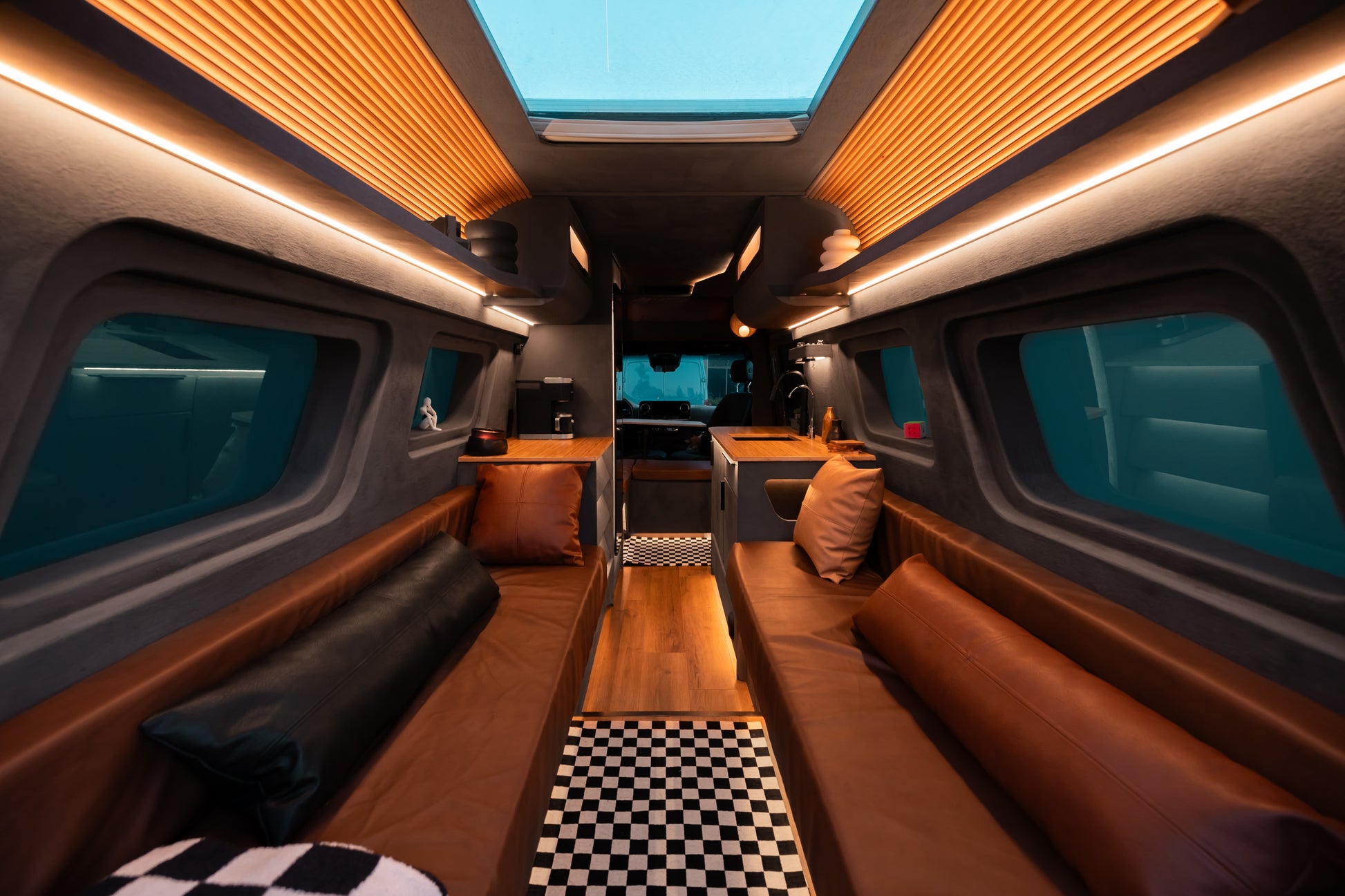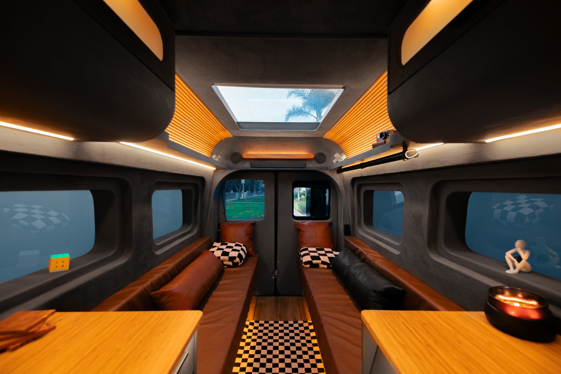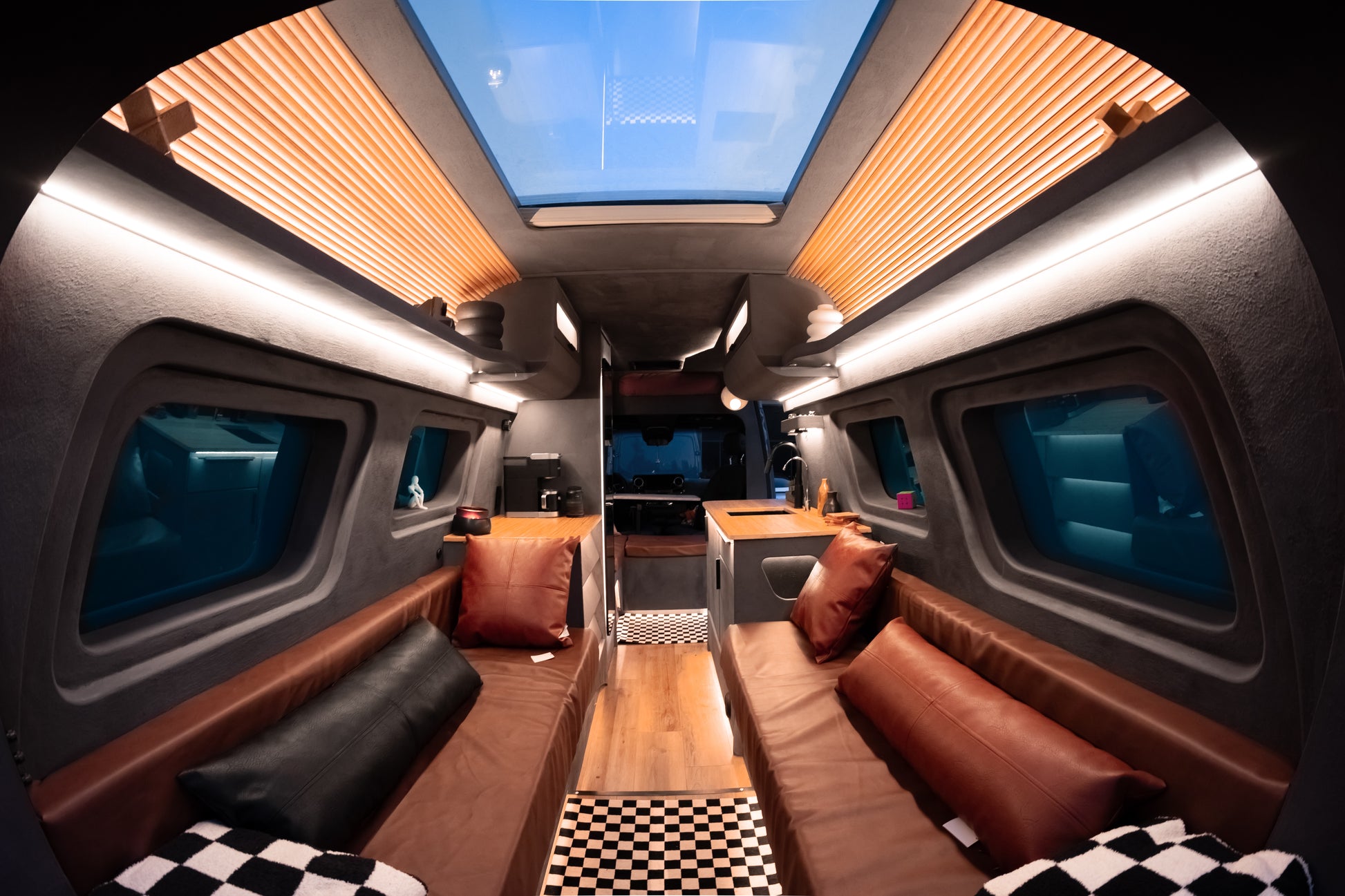 - Large Skylight: A stunning 36″ x 48″ skylight made from ½-inch tempered glass. It floods the van with natural light and is strong enough to hold up to 3 people standing on it—perfect for stargazing or watching sunset from the roof.