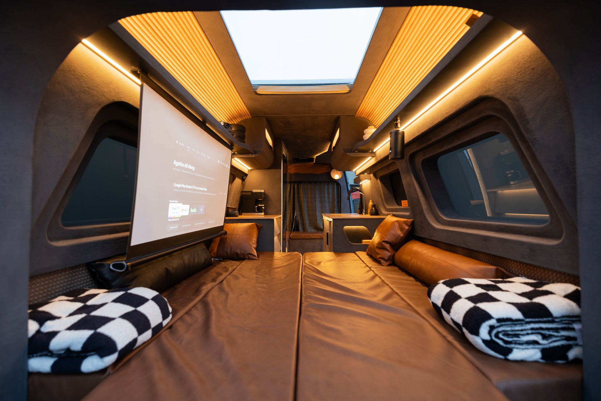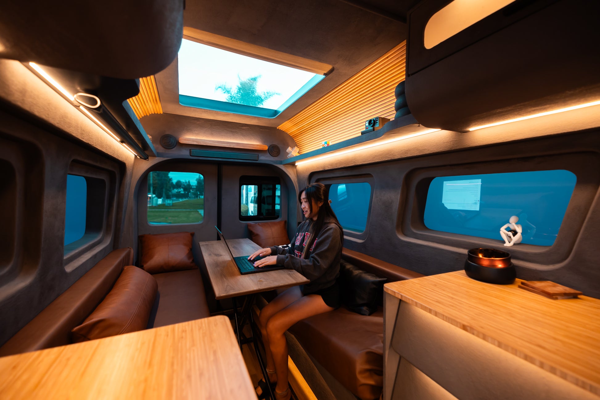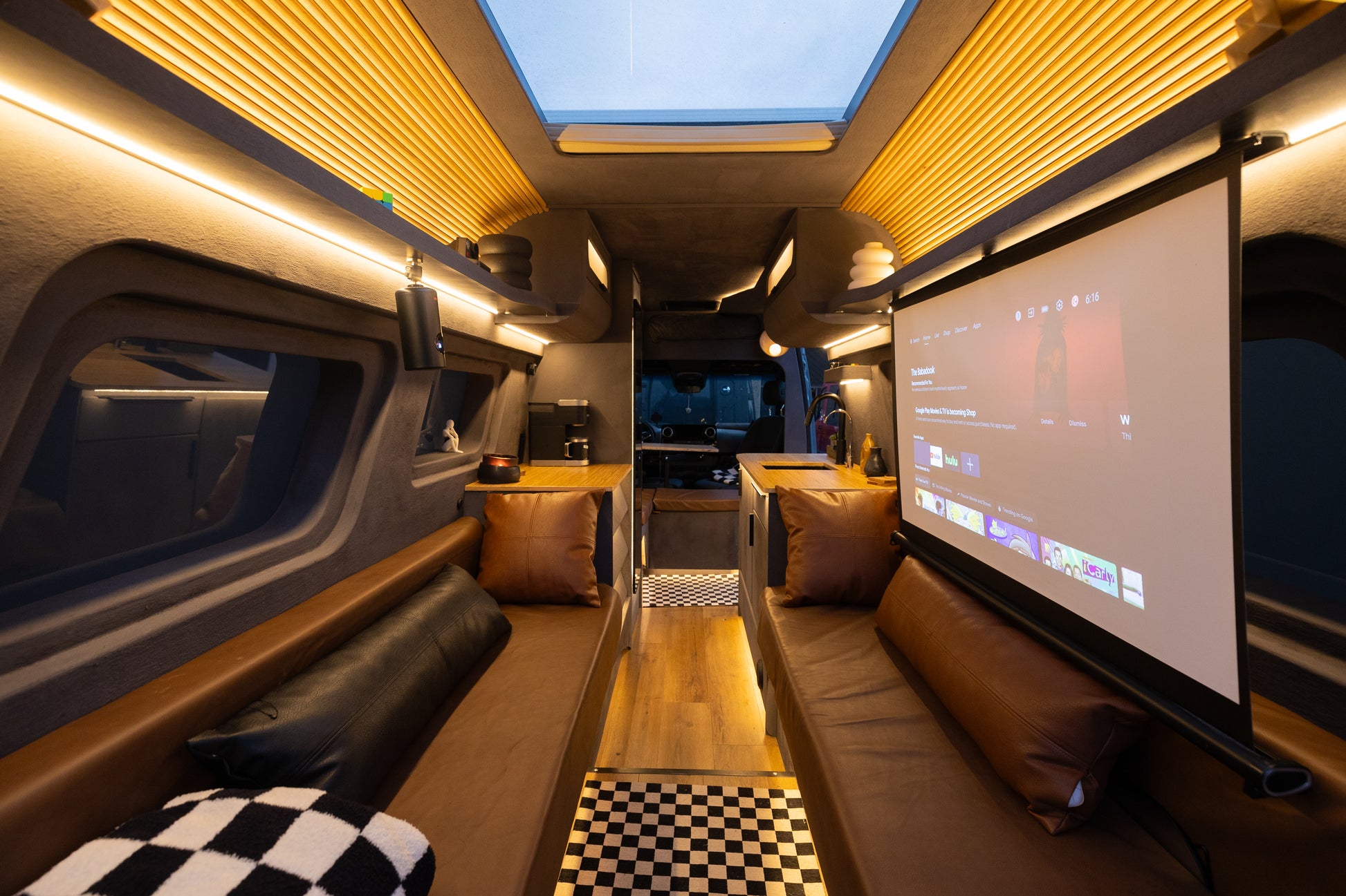 - Large Skylight: A stunning 36″ x 48″ skylight made from ½-inch tempered glass. It floods the van with natural light and is strong enough to hold up to 3 people standing on it—perfect for stargazing or watching sunset from the roof.