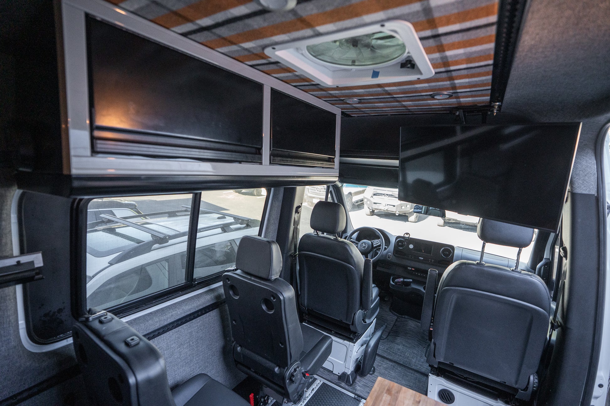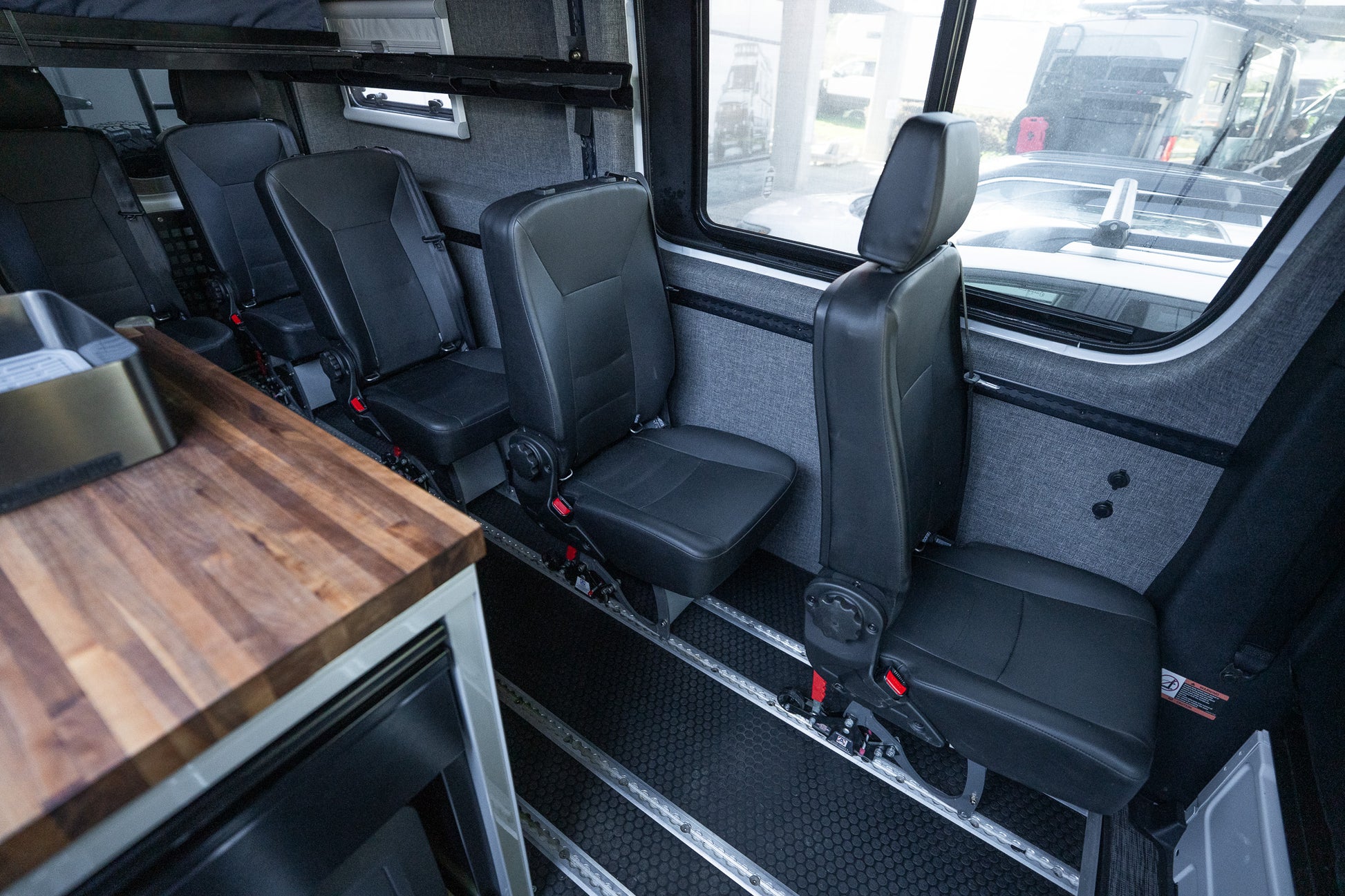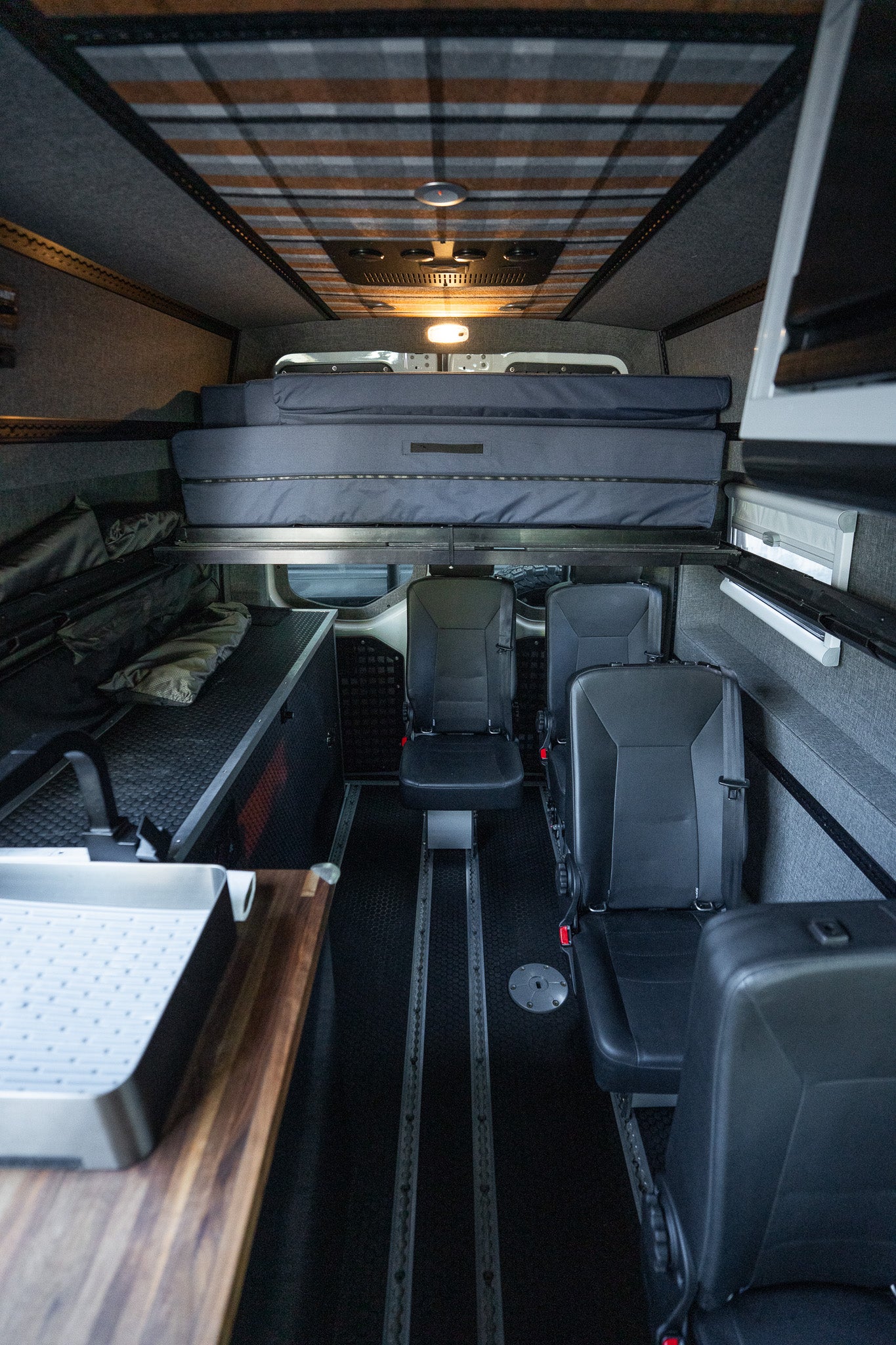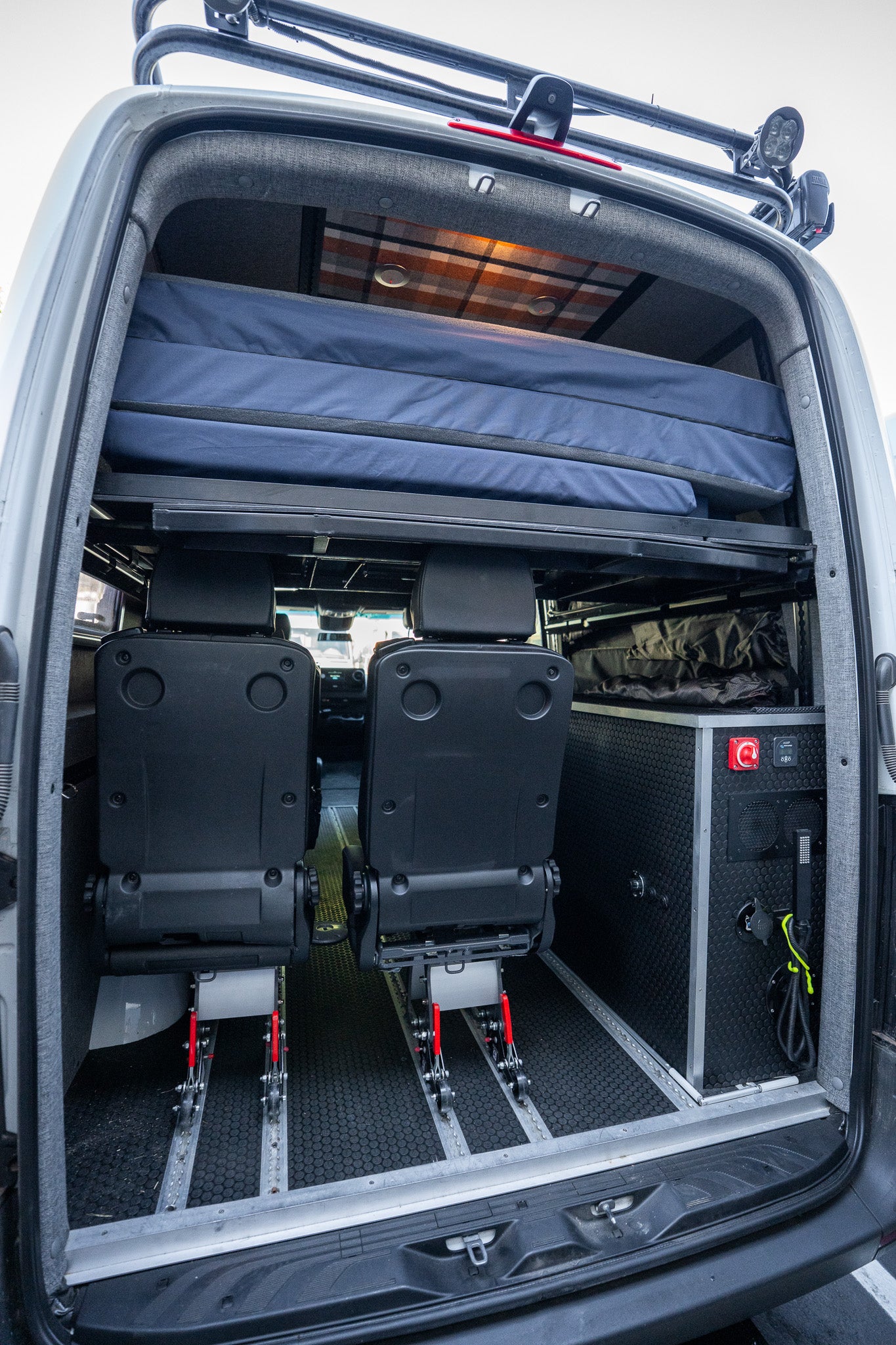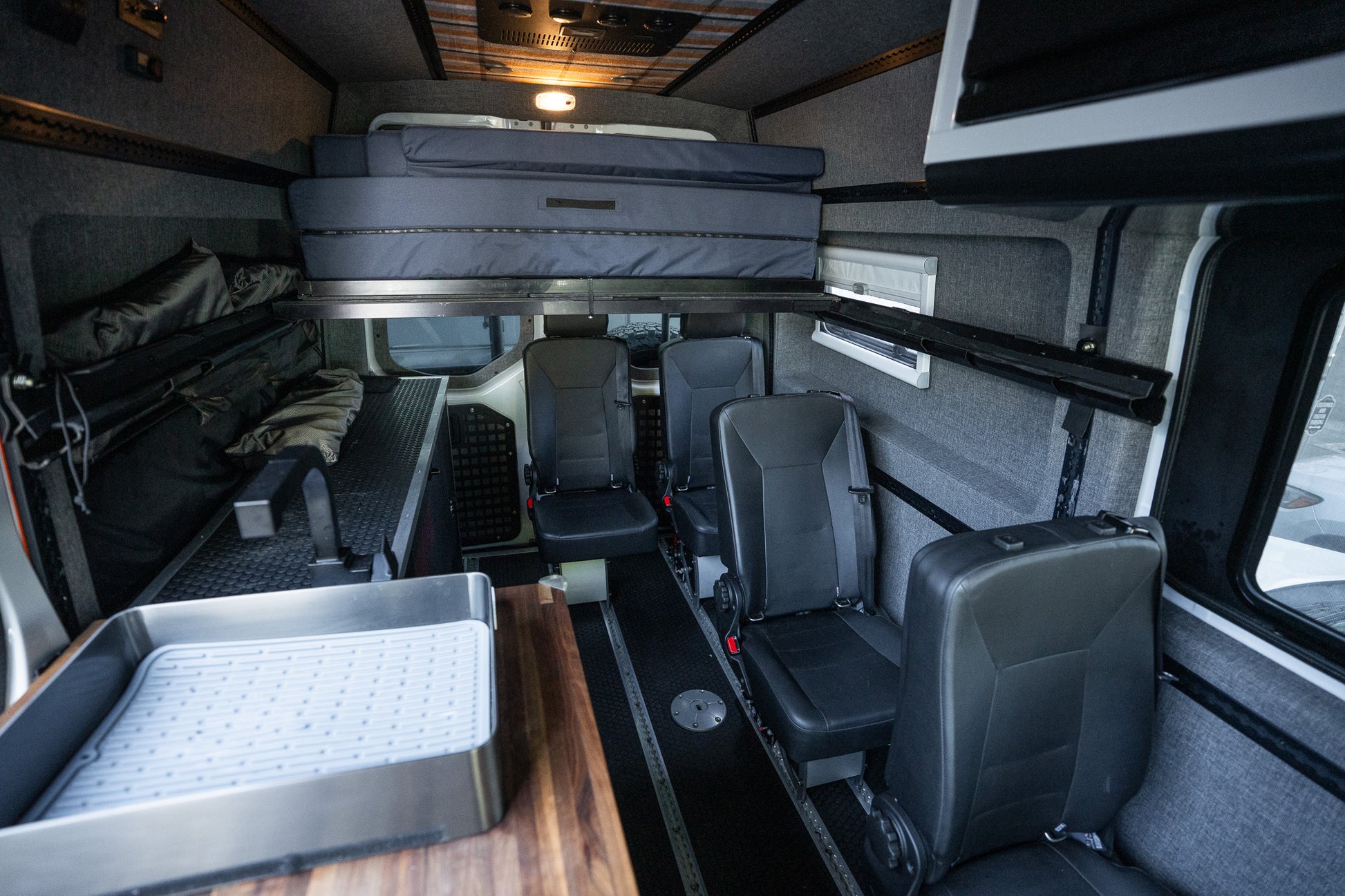 Additional passenger seating makes it easy to bring friends or family along for the ride, while the rear folding bed provides a comfortable sleeping solution that can be stowed away to maximize cargo space when not in use. Aluminum cabinetry keeps the build durable and lightweight, improving overall efficiency and performance both on and off the road.