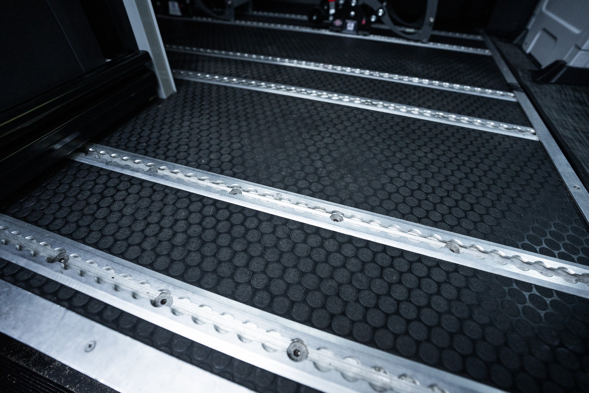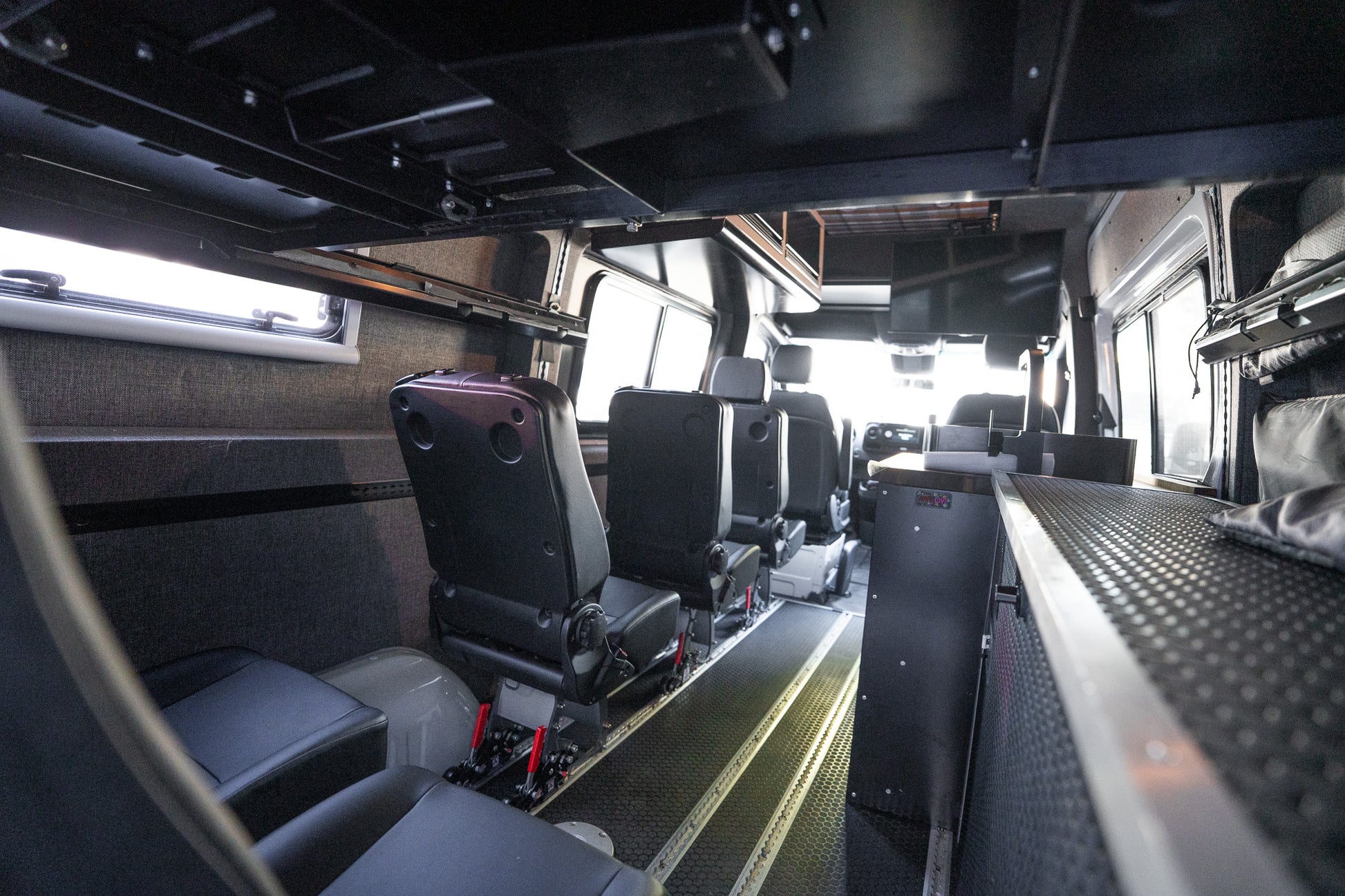 Inside, the van features an intelligently designed modular interior system with extensive L-track throughout, allowing you to easily reconfigure gear, storage, and seating based on your needs.