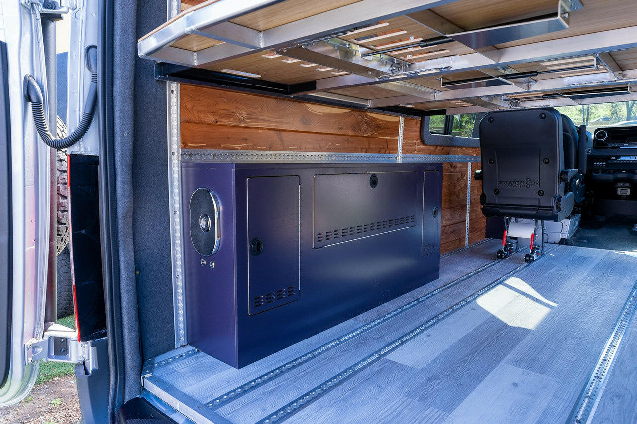 The Rogue Expedition is the ultimate luxury sportsman van. Featuring a fully adjustable Moab bed and more L track than anyone could ever use, the Expedition provides endless mounting points and storage attatchment options, while staying relatively open and spartan for utility purposes. The bed platform can be fully removed, or broken up into sections, even placed at different levels to be used as a bench or for storage optimization. Utilizing the smartfloor system the van can be configured with as many seats as desired, all of which can be moved, adjusted and removed on the fly, most floors come with 2-6 L tracks runnning the full length of the van, but can feature as many as 14. The only cabinet in the van runs along the Driver's side wheel well and houses the plumbing and electrical systems.