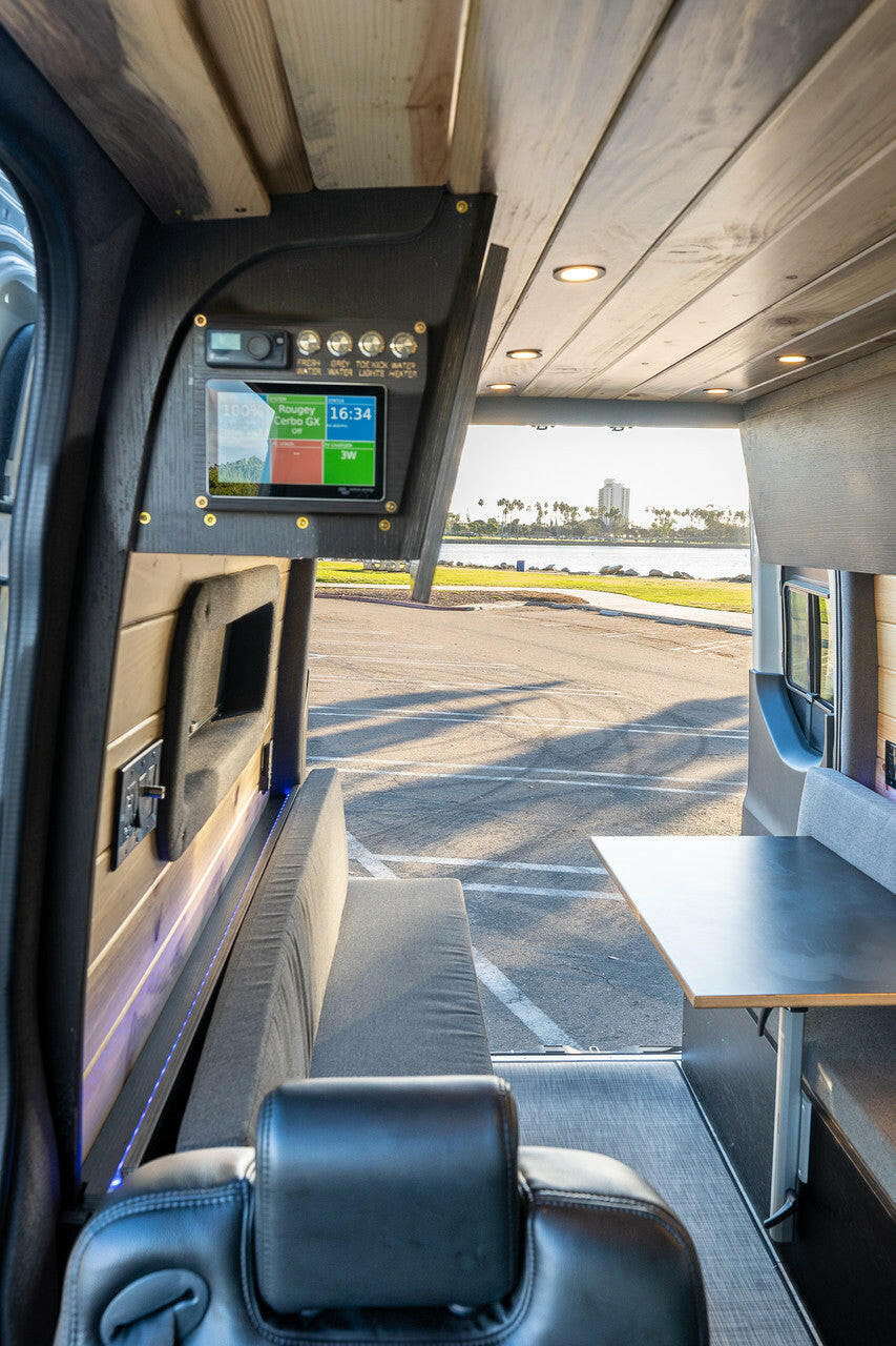The Rogue Voyager features (also pictured with optional rooftop tent or integrated poptop) an open staggered second row seating area w/ dual reclining and spinning captain chairs, followed by a full size fridge on the driver’s side and dueling benches/dinette that convert into a bed. Electrical is housed in the Passenger side bench, while the outdoor shower is housed in the Driver's side bench. Many customers choose to add either a cabbunk sytem up front for up to two extra beds for younger kids, or they opt for a rooftop tent, weather that be externally acessible or an integrated model that is accesed from the inside of the van.