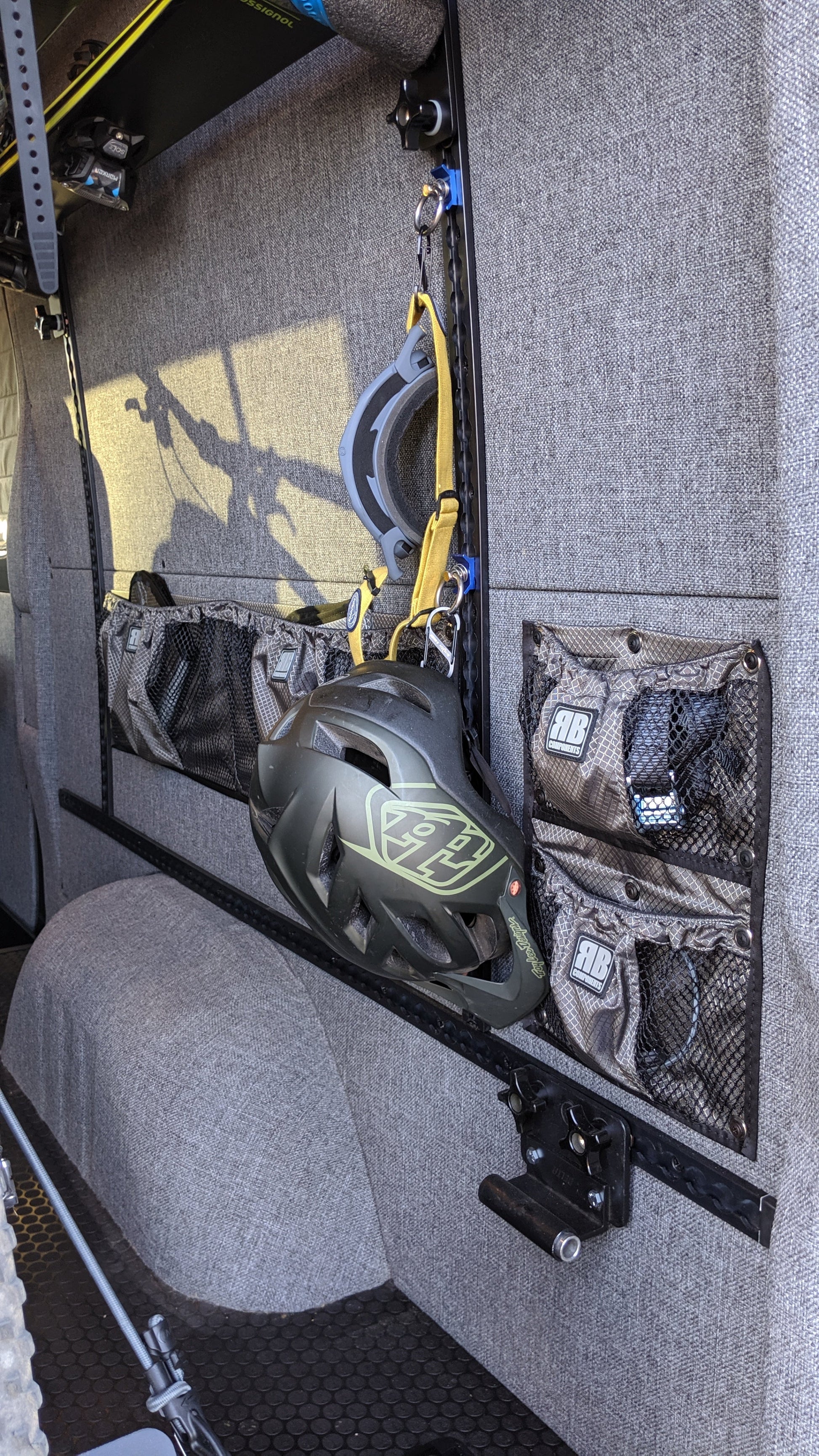 This 10"x14" (overall size) double stuff bag mounts just about anywhere to allow easy access. The elastic top bands keeps "stuff" inside while the open mesh design allows you to see what "stuff" is in your bag.